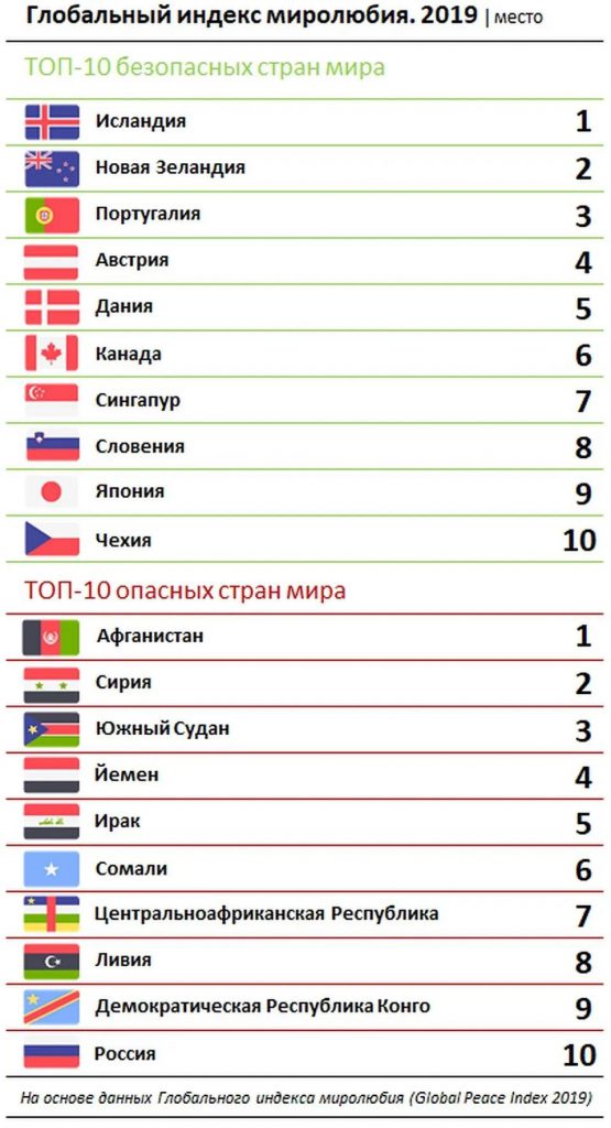國內的和平和與其他國家的關系在經濟和整個國家的發展中發揮著重要作用。根據「全球和平指數」顯示,全球最安全的國家有冰島、葡萄牙、澳大利亞和丹麥。排名前10的國家還包括加拿大、新加坡、斯洛文尼亞、日本和捷克。參與排名的總計163個國家。