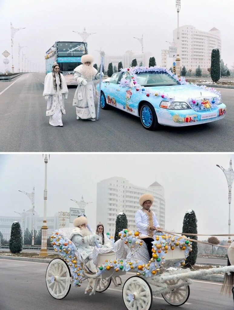 今年,嚴寒老人和雪姑娘從塔斯拉姆街和馬赫圖姆庫里大道的十字路口開始他們的節日遊行。與參加遊行的首都青年居民一起,節日「主角」沿著一片新樓、「居爾茲明」購物中心和阿拉拜犬紀念碑乘車駛向「阿萊姆」廣場。