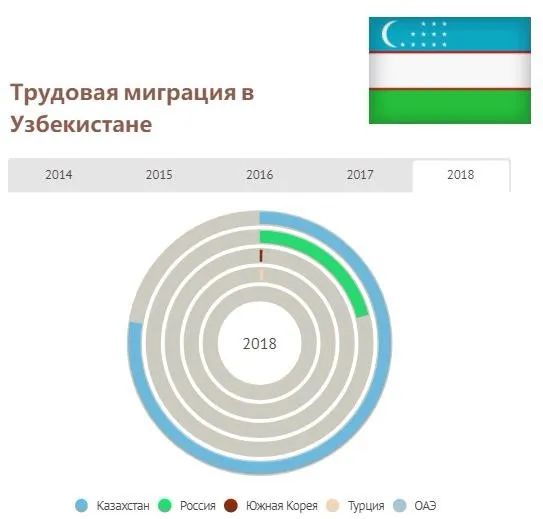 根據烏茲別克斯坦國家統計委員會的數據,過去五年從烏茲別克斯坦前往哈薩克斯坦的勞動移民人數增加了10倍,達355540人。2018年,在土耳其工作的烏茲別克斯坦人數為34399,在阿聯酋的工作人數為4578。有一年流向俄羅斯的勞動移民從94萬減少到85萬。專家認為,這可能是由於2014年俄羅斯盧布貶值,換成美元後,勞動移民的收入實際上減少了一半。