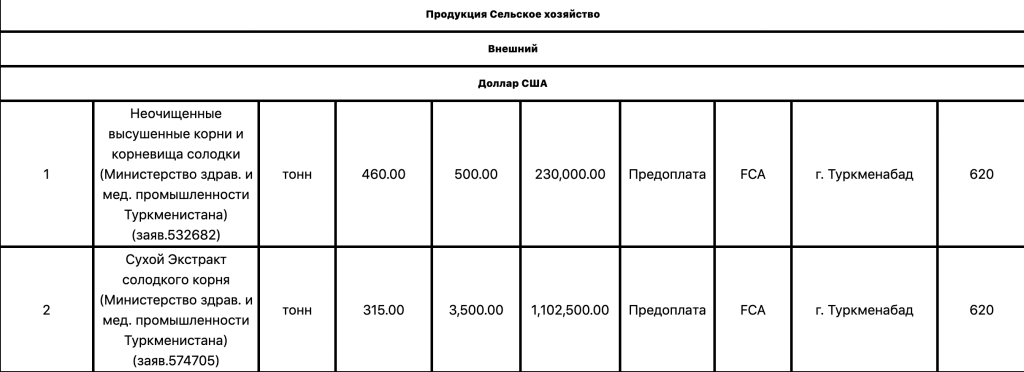 據交易所網站報道,土庫曼斯坦以每噸500美元的價格對外銷售了460噸未經處理的甘草乾燥根及根莖,總價23萬美元。甘草根提取物315噸,每噸3500美元,總價110.25萬美元。#土總統要求保證食品充裕,但國營商店仍出現糧食短缺