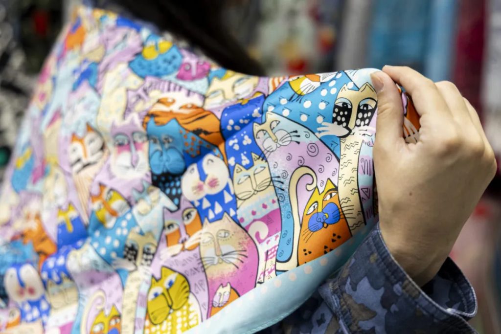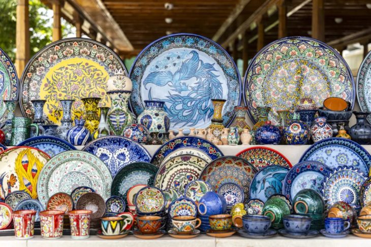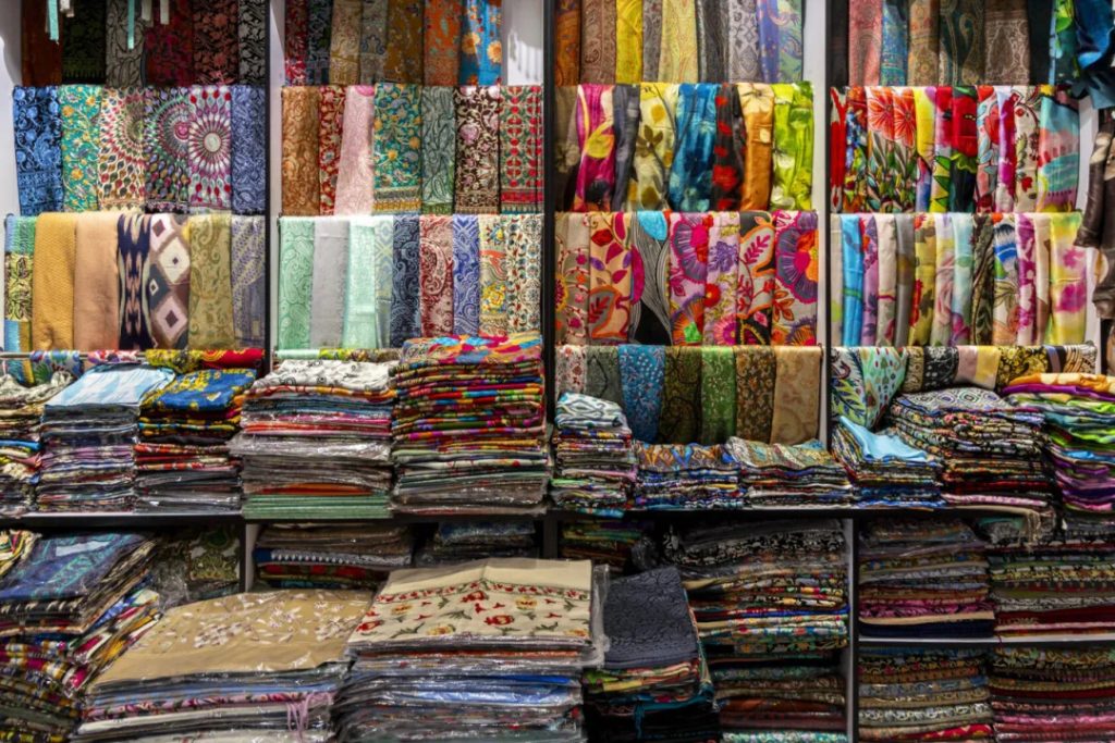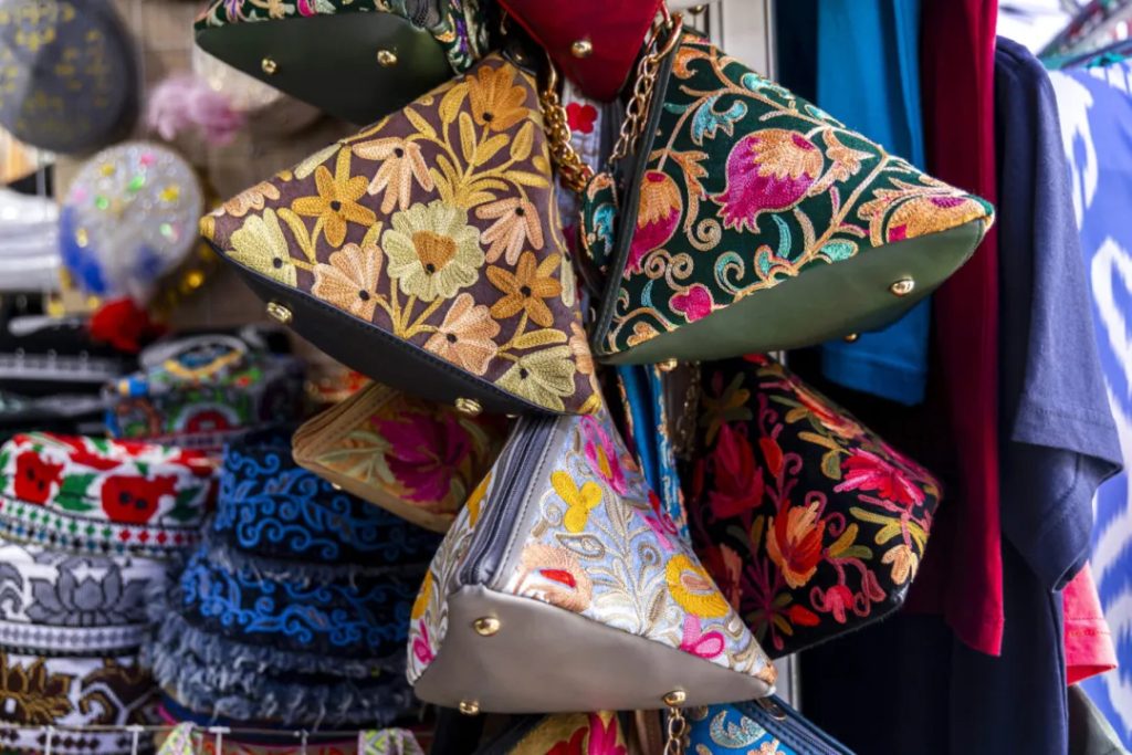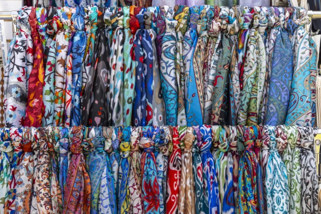 在撒馬爾罕老城的集市上,絲巾種類繁多。當地匠人採用天然絲與人造絲為原料,呈現花卉、幾何紋樣、水墨暈染等東方圖案。撒馬爾罕絲綢以其韌性和柔潤光澤著稱。可選窄版或寬幅款式,既有手繪真絲珍品,也有印著小動物或名畫復刻的時尚單品。
