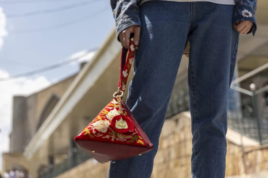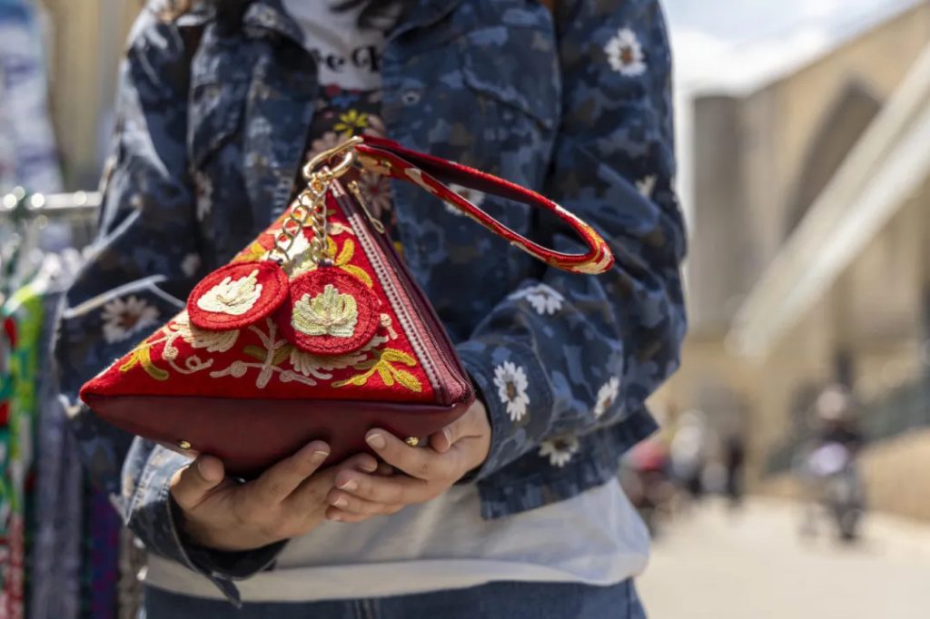 這款充滿烏茲別克斯坦風情的三角手包是目前最熱單品。包身飾以傳統手工刺繡——艷麗的花卉、石榴紋樣、棉桃圖案等東方文化符號,每一針都採用飽滿絲線精心繡制。單層大容量設計,搭配短提手,盡顯民族時尚。