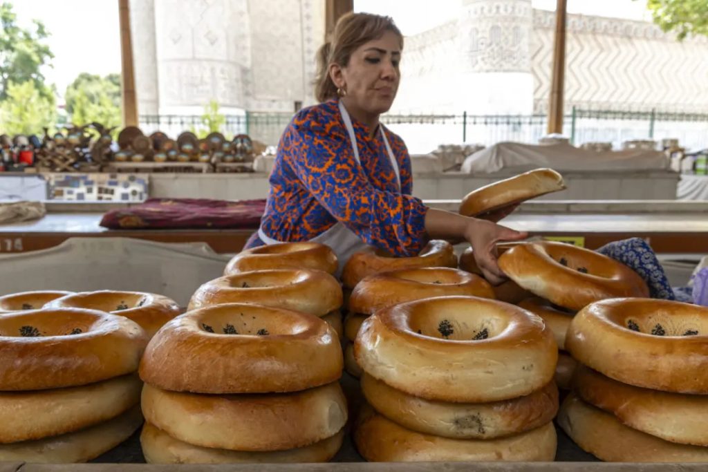 撒馬爾罕饢是當地城市名片,以厚軟內芯和硬脆外皮著稱。使用傳統工藝混合酥油揉制面團,用饢針壓花,撒芝麻或黑孜然烤制。常溫保存10天,冷藏可保存3個月。重量250克至1.5公斤,節日款還會裝飾乾果和彩色花紋。