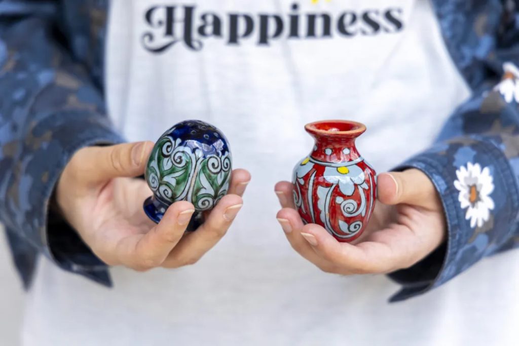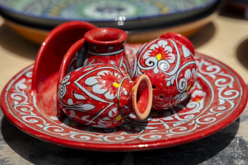 這些特色手工彩繪器皿包含鹽罐、胡椒瓶、牙籤筒和紙巾架,配以可作底托的餐盤。迷你陶罐造型的容器,搭配繁復的藤蔓花紋與東方花卉彩繪,既是實用廚具,又是點綴餐桌的異域藝術品。