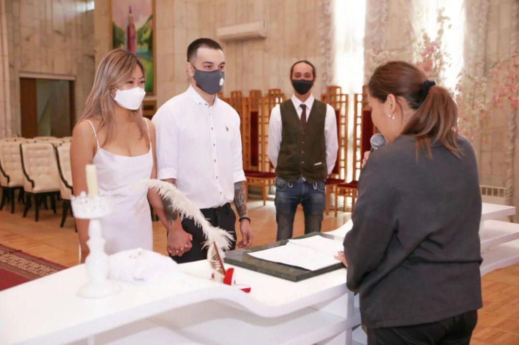 婚姻登記處的工作人員在門口看到我們——一對帶著口罩的新婚夫婦時,非常震驚。事實證明,幾乎所有新人都取消了證婚儀式並推遲登記日期。但她還是為我們舉行了一個小型儀式,頒發了結婚證書,之後我們回家舉行了慶祝活動。