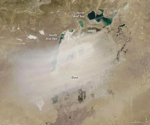 科學家也使用衛星來追蹤風在何時何地傳播最多的灰塵。通過衛星近10年數據的分析發現,咸海的粉塵輸送在春季(3月至5月)和初冬(11月至1月)達到峰值。在春季,經常會出現東北風和西南風,其中42%的塵埃吹向北部,32%吹向南部,26%吹向西部,這就是一個大概的情況,上面我們說是人類引起的,到底是如何改變的?