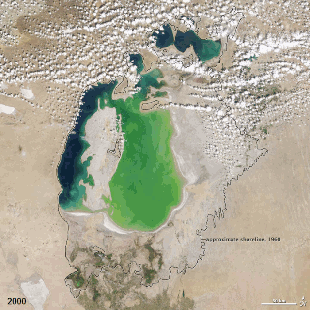 NASA報告指出,自1960年代以來,咸海一直在萎縮,當時蘇聯在哈薩克斯坦,烏茲別克斯坦和土庫曼斯坦的乾旱平原上進行了一項重大的引水工程,並將河水轉向了原本會流入咸海的農作物區域。