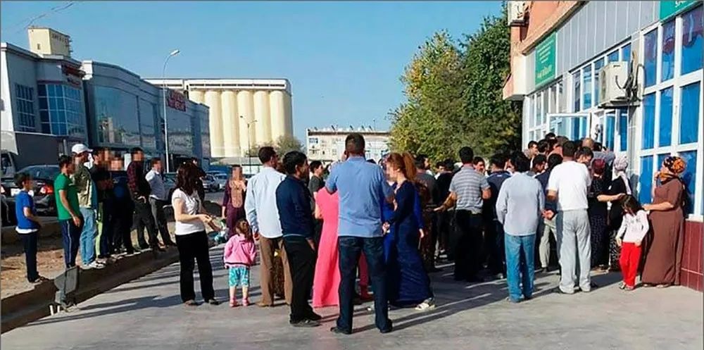 為了買食物,周邊村民必須早早來到巴依拉馬利市,在國營商店營業前排隊3-4個小時。每家商店門口大約有50-60人。