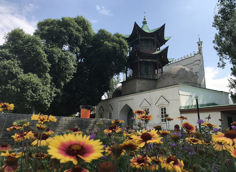 這座清真寺始建於1887年,耗時5年完工,於1892年建成開放。它由當地穆斯林商人贊助修建,負責設計的是中國設計師洪比克。為何這座清真寺會由中國設計師來設計?博物館講解員告訴我們,贊助者想修建一座沒有釘子的清真寺,可是當地沒有人可以實現這個想法,當地的長老告訴募捐者曾在中國見過這種建築,遂請來了中國的設計師來完成此項任務。清真寺的主要建築材料是天山雲杉的原木,清真寺內有110個圓柱,外面有60個,整體建築沒有一顆釘子。